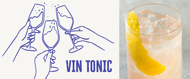 Fülle ein Longdrinkglas mit Eiswürfeln und Weißwein. Gieße anschließend vorsichtig das Tonic Water dazu und garniere den Vin Tonic mit einer Zitronenzeste.