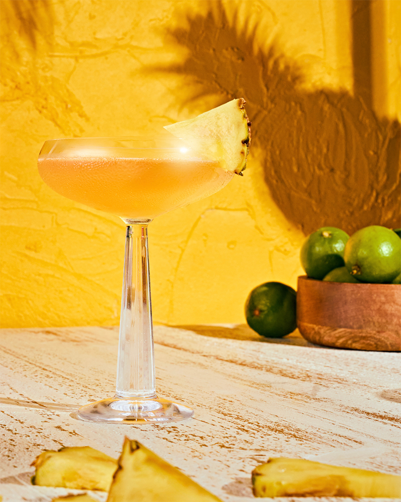 Zubereitung: Die Zutaten in einen Shaker mit Eiswürfeln geben und kalt schütteln. Den Drink in ein Coupette Glas abseihen und mit einem Ananasstück garnieren.