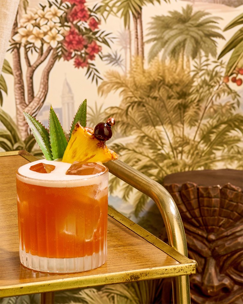 Garnitur: Ananasblätter, Limettenscheibe, Cocktailkirsche